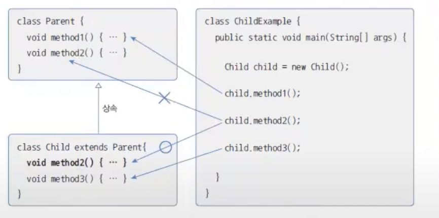 부모 클래스의 모든 메소드가 자식 클래스가 사용하기에 적합하지 않을 수 있다. 이러한 메소드는 자식 클래스에서 재정의해서 사용해야한다. 이것을 오버라이딩이라고 한다.