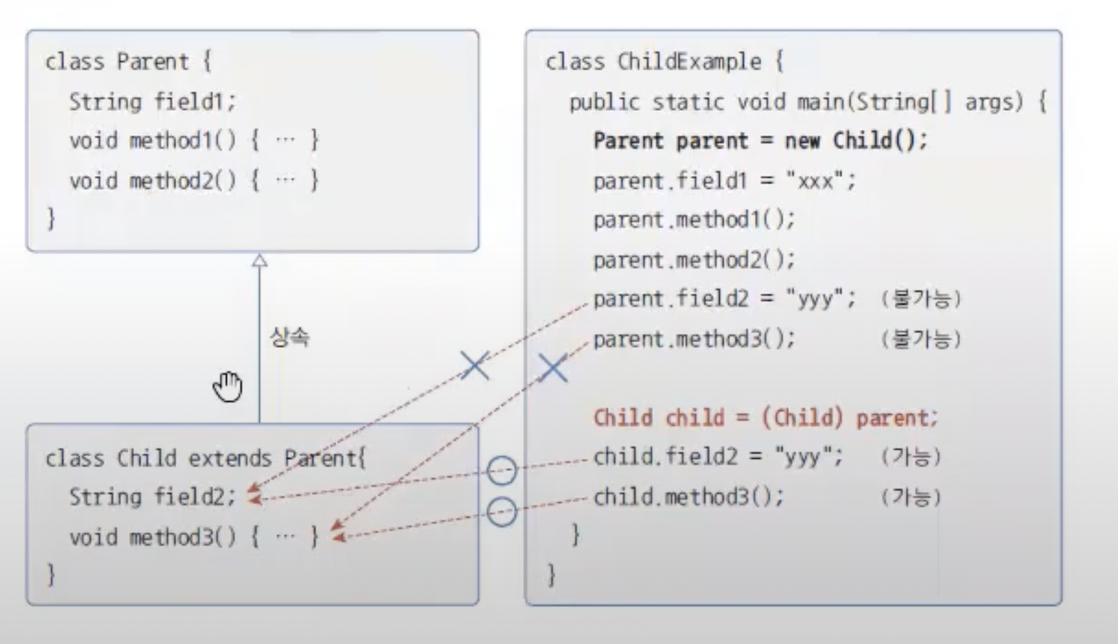 강제 타입 변환을 하는 이유는 Child 객체의 모든 멤버(필드, 메소드)에 접근하기 위해서이다.