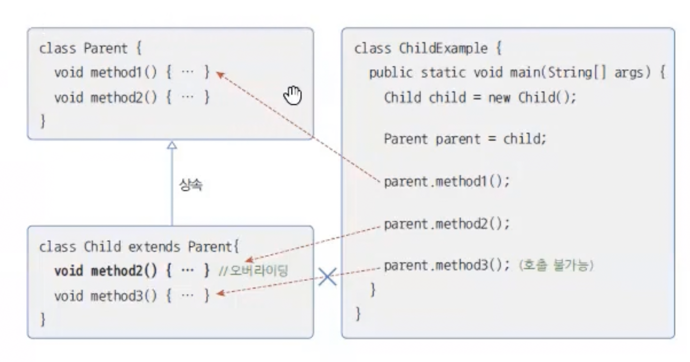 메소드가 오버라이딩 되었다면 해당 부모 메소드는 숨겨지고 자식 메소드는 우선적으로 사영된다.