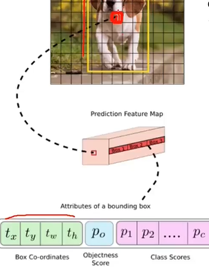 점이 하나 주어졌을 때, 윈도우의 시작 좌표와 윈도우의 폭, 높이, 오브젝트일 확률 값, 80개의 클래스일 확률 이와 같은 85개의 값을 추정하는 알고리즘이라고 보면 된다. (그리드 격자 하나당)