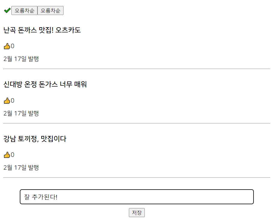 글을 입력 하고 저장버튼을 누르면 상단에 발행된 글이 뜨게 된다.