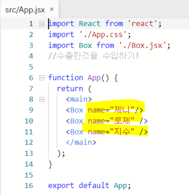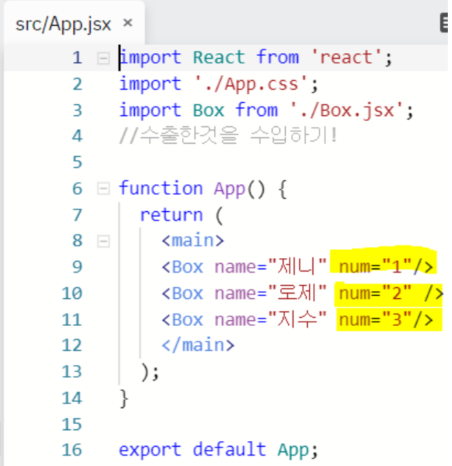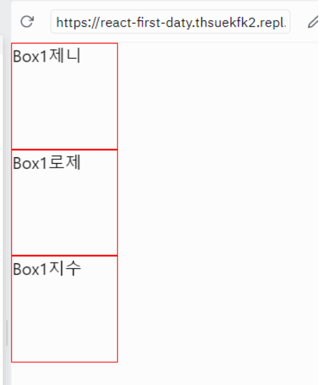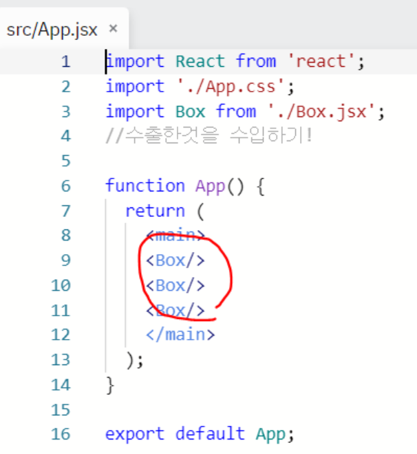 import 로 수출한 함수를 불러오고 <Box/> 와 같은 형식으로 사용하면 간단하게 박스 3개를 만들 수 있다