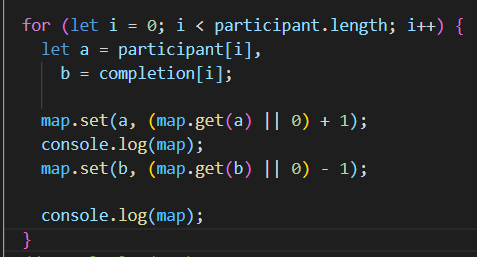 근데 만약 map에 a가 이미 추가되어있는 상황이라면(동명이인) map에 key가 a value가 1인 객체가 있는 상황입니다. 그렇게 되면 map.get(a)가 true가 되므로 map.get(a) || 0)가 map.get(a)가 나오게 되고(즉 1이 나오게 됨) +1을 하면 a의 value값으로 2가 전달이 되는것이죠 이제 b를 살펴보면 같은 원리로 b가 이미 map에 있다면 (즉 완주자라면)a 1 인 상태에서 -1이 되어 value값이 0이 됩니다 반대로 없는 경우에는(즉 완주를 못함) a에서는 있었으므로 value값이 1이지만 완주를 못해 b에는 없으므로 아무변화가 없어 value값이 1인상태로 남게 됩니다 또한 동명이인의 경우에는 a에서 한번더 1이 더해져 value가 2인상태에서 b에서 1을 뺀다고 해도 값이 1이 남게됩니다 결국 아래 for 문에서 value값이 0이상 즉 1 인 값들(미완주자, 동명이인)이 출력이 되게 되는것이죠