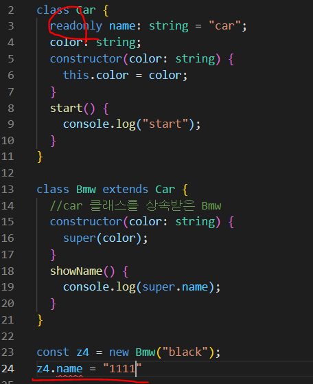color: string; //타입스크립트에서 클래스를 작성할 때, 멤버변수 미리 선언 해 줘야한다.